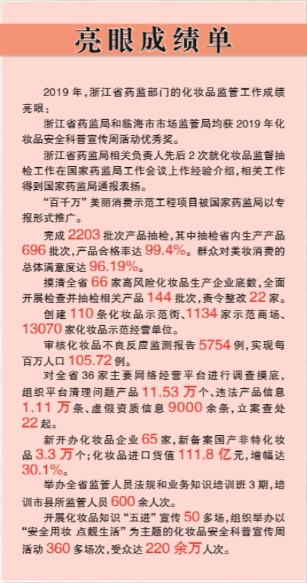 2019年,浙江省藥品監管部門嚴防嚴控化妝品安全風險,創新探索監管方式,規范化妝品行業發展;持續深化改革,優化服務,健全監管體系,提高監管能力水平,化妝品監管工作取得新成效。2019年,浙江省化妝品監督抽檢合格率達99.4%,群眾對美妝消費的總體滿意度達96.19%。“浙產美妝”站上全國化妝品產業發展第一方陣。