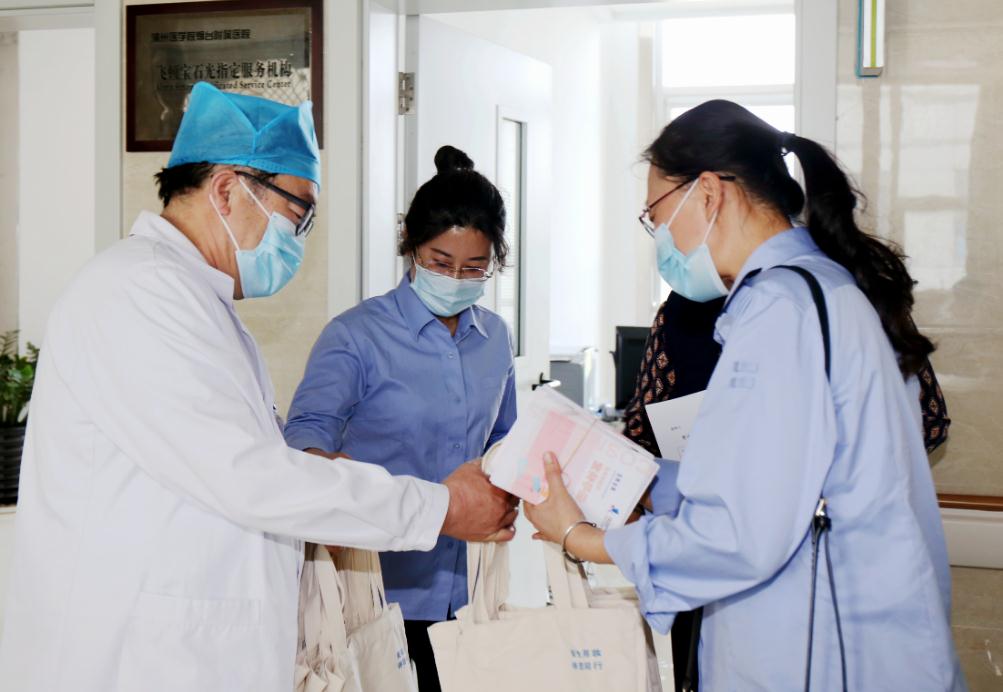 煙臺市牟平區市場監管局工作人員前往當地不良反應哨點醫院發放宣傳手冊,并與該院皮膚科大夫就化妝品不良反應相關工作進行溝通。(山東省藥監局供圖)