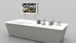 5種中藥藥劑模型包括丹、丸、散、膏、湯,每種藥劑設置一組炮制工藝的操作裝置,每套操作裝置由按鈕、滑塊及炮制工藝指示條構成。體驗時,參與者選擇一種想要了解的藥劑炮制工藝,并按下按鈕,相應按鈕燈光點亮;隨后沿指示條滑動滑塊到炮制工藝各個步驟,顯示屏中播放多媒體視頻,演示相應工藝步驟的制作方法及過程?;顒又校瑓⑴c者每次只能選擇一組操作裝置進行體驗。