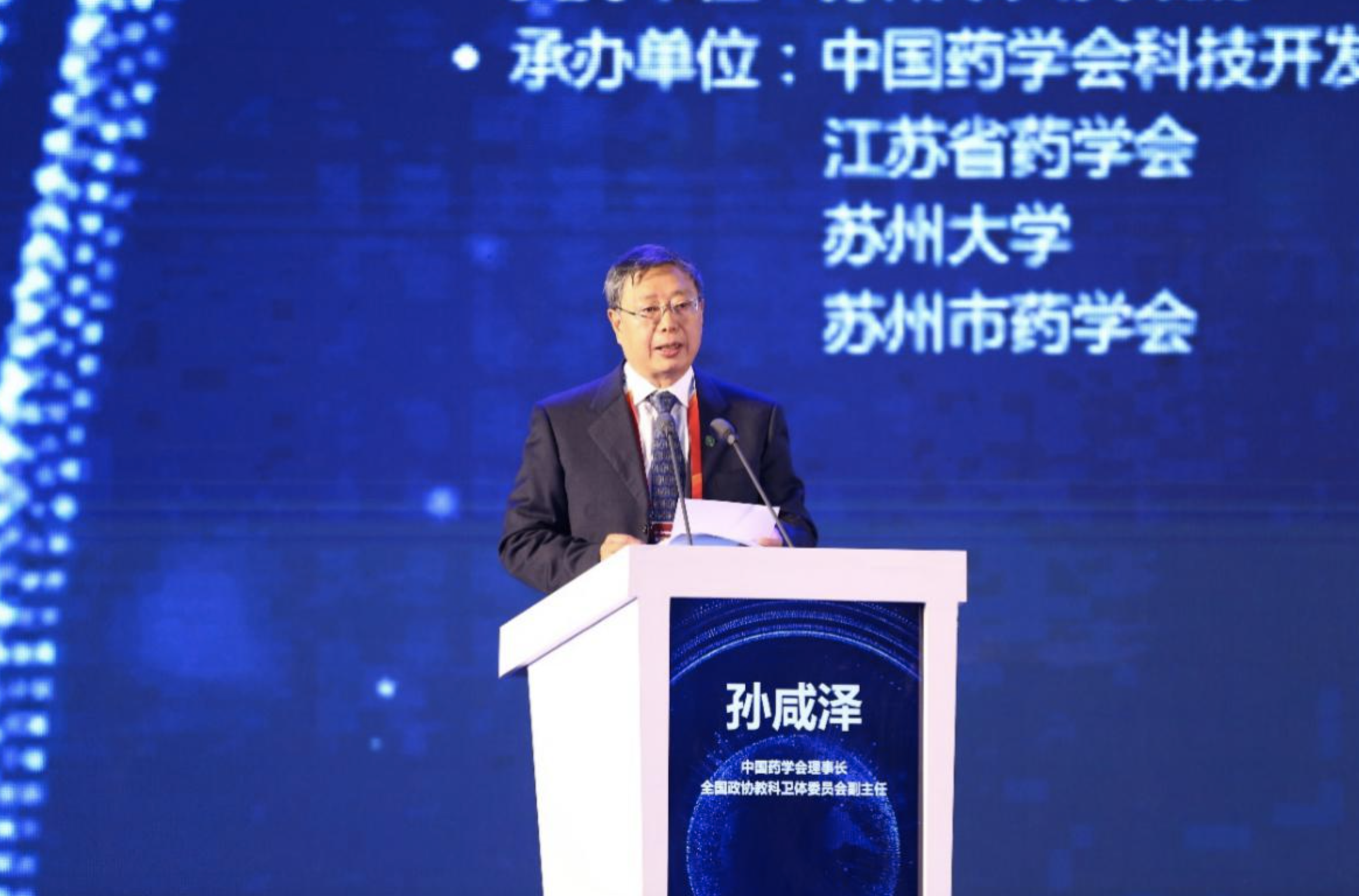 圖為中國藥學會理事長、全國政協教科衛體委員會副主任孫咸澤致辭。