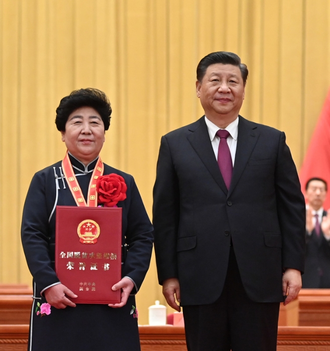 2月25日,全國脫貧攻堅總結表彰大會在北京人民大會堂隆重舉行。這是習近平為全國脫貧攻堅楷模榮譽稱號獲得者白晶瑩頒獎。新華社記者 李學仁 攝