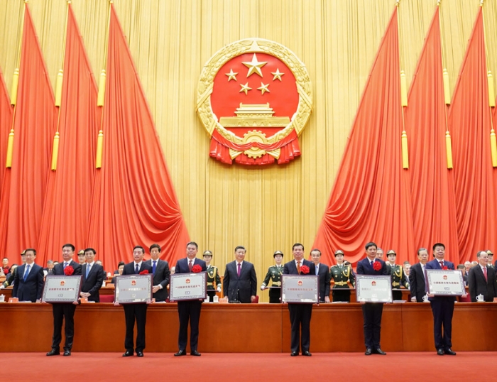 李克強主持大會,汪洋宣讀表彰決定,栗戰書、王滬寧、趙樂際、韓正、王岐山出席。