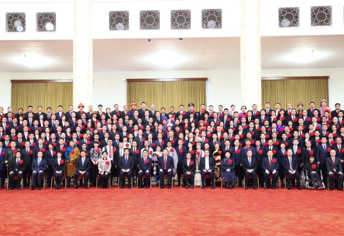 2月25日,全國脫貧攻堅總結表彰大會在北京人民大會堂隆重舉行。會前,習近平等會見全國脫貧攻堅楷模榮譽稱號獲得者,全國脫貧攻堅先進個人、先進集體代表,全國脫貧攻堅楷模榮譽稱號個人獲得者和因公犧牲全國脫貧攻堅先進個人親屬代表等。新華社記者 謝環馳 攝