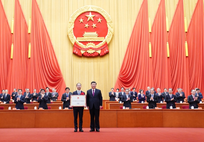 2月25日,全國脫貧攻堅總結表彰大會在北京人民大會堂隆重舉行。這是習近平為全國脫貧攻堅楷模榮譽稱號獲得者國網西藏電力有限公司農電工作部頒獎。新華社記者 燕雁 攝