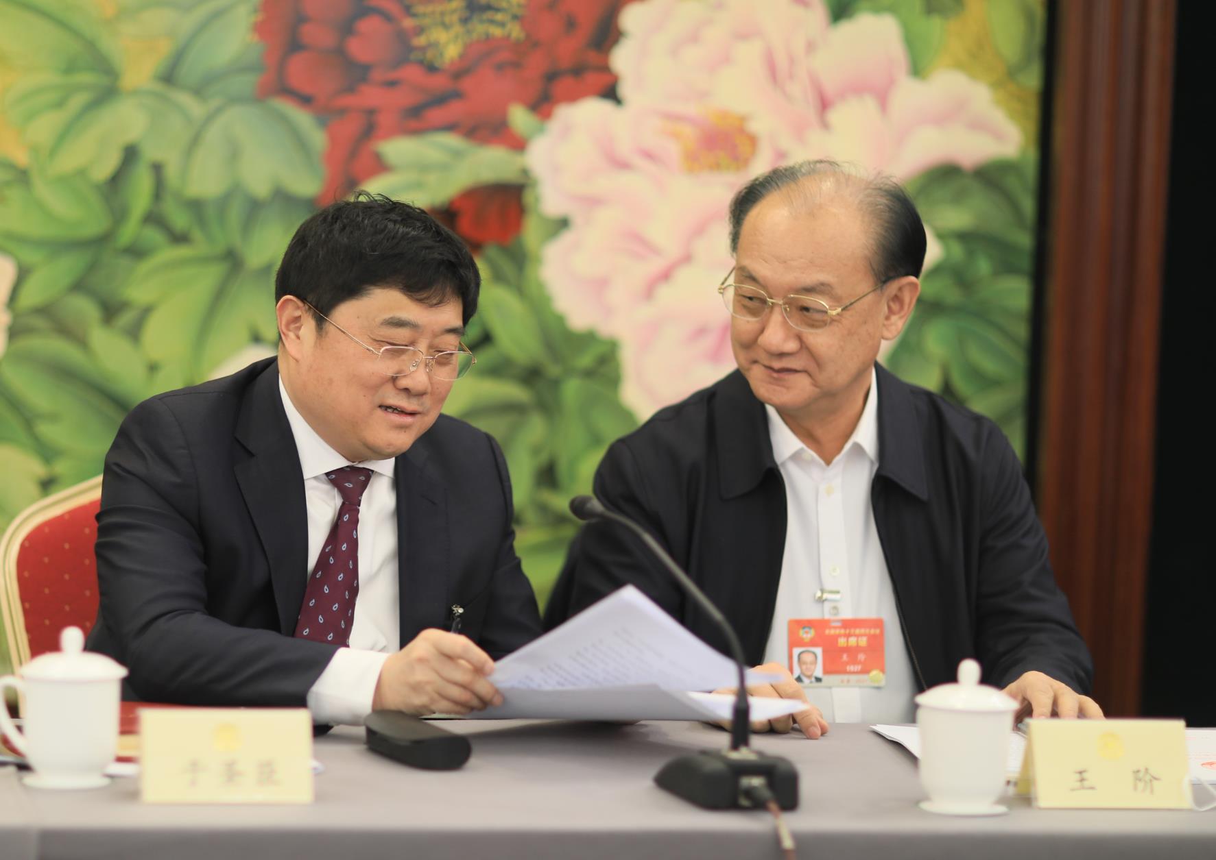 圖為全國政協委員、北京凱博通投資股份有限公司總裁于圣臣與全國政協委員、中國中醫科學院首席研究員王階在做小組討論。(顧建文 攝)