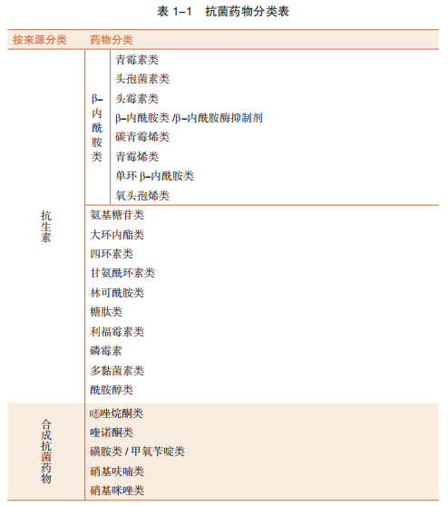 抗菌藥物分類如表1-1所示,其作用機制、抗菌譜、藥效學及藥代動力學特點各有不同,在臨床使用也各有優(yōu)劣,應掌握各類藥物特點,合理使用。
