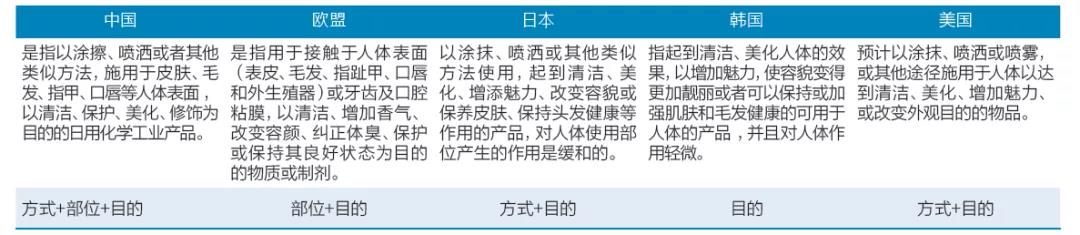 有關化妝品的定義,國際上并無統一,各國主要從方式、部位、目的三方面對化妝品進行了定義(見表1)。目的不同使得化妝品定義范圍不一致,如保持良好狀態、增加魅力等均具有較廣泛的外延。雖然化妝品的定義因國家而略有不同,但它有一個共同的定義,即用于清潔和美容。