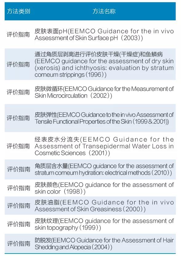表4 歐洲化妝品及其他外用產品功效評價協會(EEMCO)發布的化妝品功效評價指南