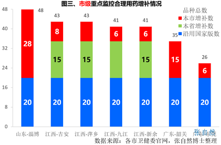 除省級外,許多地級市也出臺了本地的重點監(jiān)控合理用藥藥品目錄,尤其江西省的各地級市,如江西的吉安、萍鄉(xiāng)各有43個品種,九江和新余各有41個品種,并分別在江西省級版本的基礎(chǔ)上各新增了8個和6個品種。