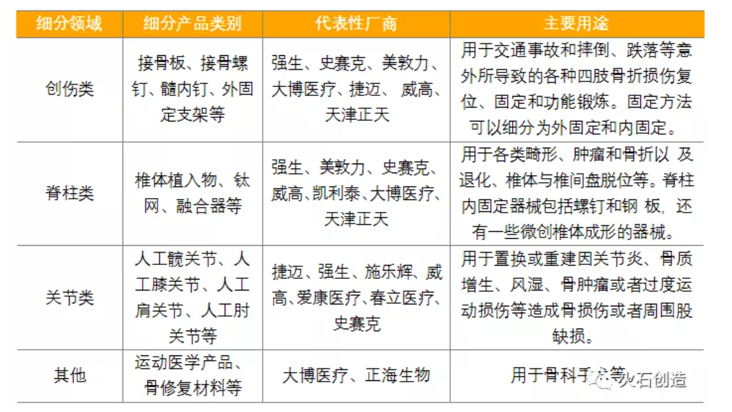 骨科植入物產品按使用部位不同可以分為創傷類、脊柱類、關節類、其他四類。前三者的市場份額占到骨科植入物市場的80%以上,主要包括骨接合植入物及關節植入物,如接骨板、接骨螺釘、髓內釘、脊柱內固定植入物、人工關節等。