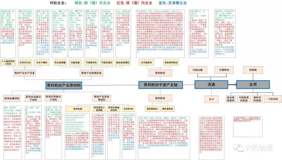 我國骨科耗材產業在上世紀80年代之前經歷了艱難的發展歷程,但為骨科器械行業的發展打下了一定的基礎。隨著國家經濟實力和科研實力的迅速提高,尤其是21世紀以后跨國企業進入中國市場,帶動了國內企業的快速發展。在不斷的學習和競爭中,國產骨科器械在各方面都取得了長足的進步。骨科醫療器械產業鏈發展情況解析如表2和圖1所示。