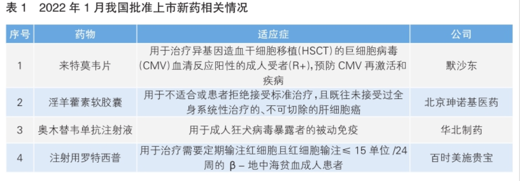 1月份,我國共批準(zhǔn)4款新藥上市,其中淫羊藿素軟膠囊、奧木替韋單抗注射液為自主研發(fā)(詳見表1)。