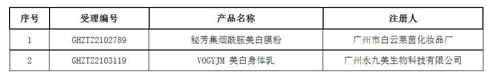 國家藥監局網站發布1期化妝品不予批準決定書待領取信息,共包括2個受理號,涉及廣州市白云萊茵化妝品廠等企業(截至8月31日)(詳見表)。