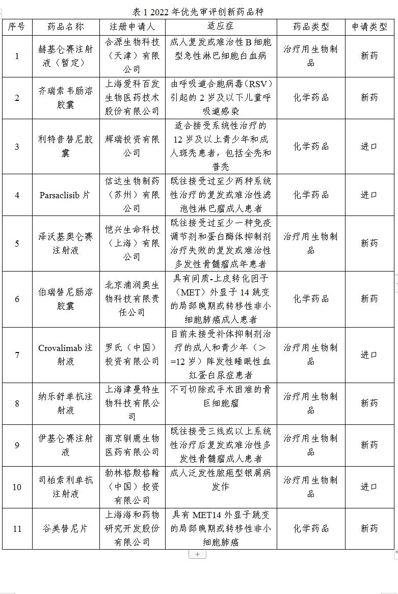 綜上所述,2022年共12件創新藥被納入優先審評名單,覆蓋11個品種,如表1所示。其中,包括5種化學藥品和6種治療用生物制品;4種創新藥為進口藥品,其他均來自本土藥企。