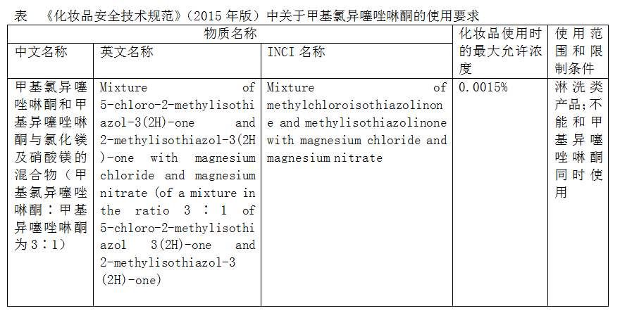 筆者不同意這種觀點。根據《化妝品安全技術規范》(2015年版),甲基氯異噻唑啉酮在化妝品中使用的形式為"甲基氯異噻唑啉酮和甲基異噻唑啉酮與氯化鎂及硝酸鎂的混合物(甲基氯異噻唑啉酮:甲基異噻唑啉酮為3∶1)",是規范中唯一明確混合物組分的防腐劑。"氯化鎂及硝酸鎂"是混合物中的必要成分,"甲基氯異噻唑啉酮和甲基異噻唑啉酮與氯化鎂及硝酸鎂的混合物"不等同于"甲基氯異噻唑啉酮、甲基異噻唑啉酮",產品包裝標簽上應進行全成分標注。
