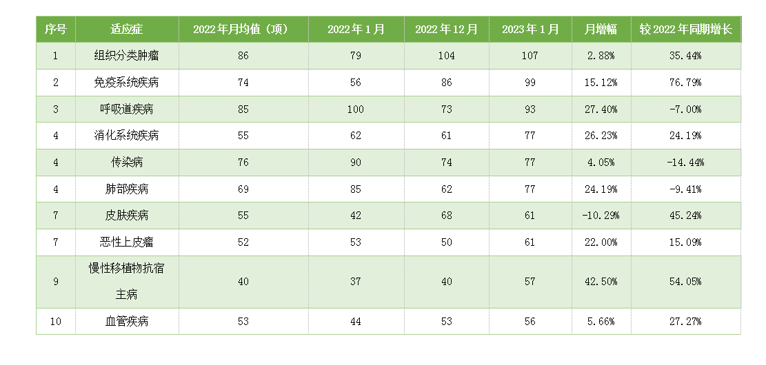 從1月份新增臨床試驗熱門適應癥領域來看,組織分類腫瘤仍為最主要的熱門研發領域, 試驗數量為107項,相較12月份上升 2.88%;其次為免疫系統疾病,但數量相較于上月上升15.12%。月增幅最高的熱門適應癥為慢性移植物抗宿主病,單月增幅均超過40%。僅有皮膚類疾病本月相較上月下降,下降幅度為10.29%。(詳見表1)