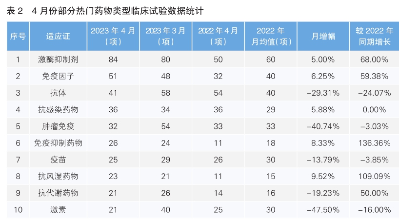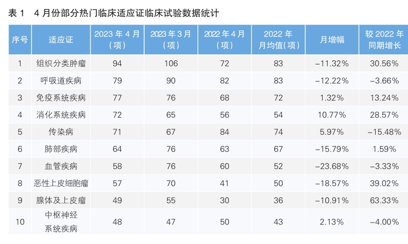從4月份新增臨床試驗熱門適應證領域來看,組織分類腫瘤仍為最主要的熱門研發領域,試驗數量為94項,相較3月份下降11.32%;其次為呼吸道疾病領域,數量相較于上月下降12.22%。月降幅最高的熱門適應證為血管疾病,單月降幅為23.68%。相較于上月,4月份熱門領域臨床試驗數量增長最快的為消化系統疾病領域,月增幅為10.77%;其次為傳染病領域,月增幅為5.97%。相較于去年同期,同比增幅最為顯著的為腺體及上皮瘤,為63.33%;同比降幅最高的為15.48%,為傳染病領域。