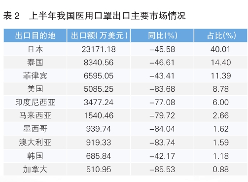 日本是我國醫(yī)用敷料第二大出口市場,上半年出口額3.22億美元,同比下降35.86%。我國出口日本最多的醫(yī)用敷料是醫(yī)用口罩,出口額為2.32億美元,占我國出口日本醫(yī)用敷料總額的71.9%。