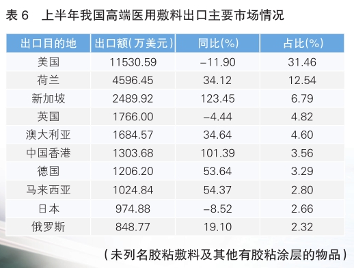 我國醫(yī)用敷料出口的亮點是高端醫(yī)用敷料(未列名膠粘敷料及其他有膠粘涂層的物品),上半年出口額3.67億美元,同比增長7.51%。這說明我國正在從以紗布類、藥棉類、繃帶類為主的傳統(tǒng)醫(yī)用敷料出口向硅膠泡沫類、藻酸鹽等高端醫(yī)用敷料出口跨越(詳見表6)。