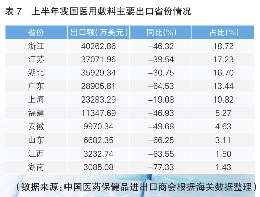 上半年,我國醫(yī)用敷料出口額排名前五的省份合計出口16.55億美元,占全國醫(yī)用敷料出口比重的76.9%;出口額排名前十的省份合計出口19.98億美元,占比92.9%,出口較為集中。