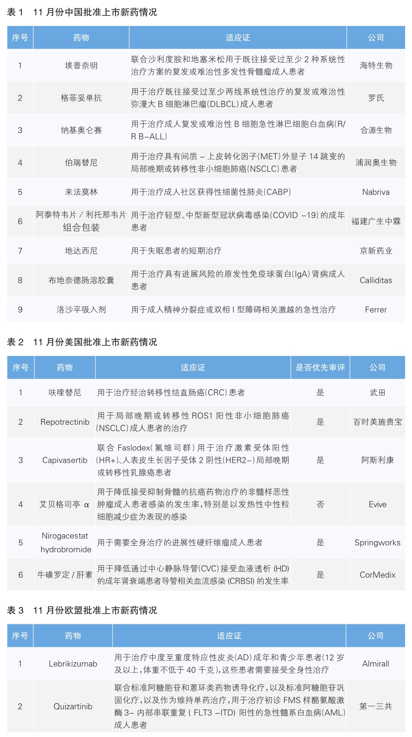 2023年11月份,美國批準了6款新藥上市。根據Pharmadigger數據庫信息,Repotrectinib、Capivasertib、Nirogacestat hydrobromide,以及牛磺羅定/肝素4款新藥為全球首次獲批;另外兩款新藥都來自中國藥企,分別是呋喹替尼和艾貝格司亭α。