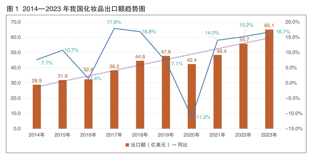 近十年來,我國化妝品出口額基本保持增長態(tài)勢(shì),從2014年的28.9億美元逐步攀升至2023年的65.1億美元;除2020年因受新冠疫情影響出口額有所下滑外,其余年份均保持正增長,且增幅大部分超過10個(gè)百分點(diǎn)(詳見圖1),充分體現(xiàn)出我國化妝品國際競(jìng)爭(zhēng)力正穩(wěn)步提升。