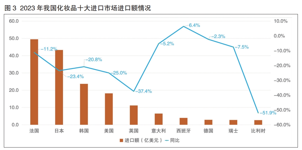 法國繼續(xù)蟬聯(lián)榜首。我國是法國第三大化妝品出口市場(chǎng),但近五年來法國對(duì)我國化妝品出口增速持續(xù)放緩,由2018年43.3%的同比增速一路下跌,2022年首次出現(xiàn)負(fù)增長,到2023年增幅深跌11.2%,我國從法國進(jìn)口額僅為49.5億美元。我國是日本第一大化妝品出口市場(chǎng),2023年,日本對(duì)我國出口減少23.4%,連續(xù)第二年負(fù)增長,我國從日本進(jìn)口額為43.3億美元。2022年,美國對(duì)我國化妝品出口近五年來首次出現(xiàn)負(fù)增長,同比下降1.2%,2023年這一降幅躍升至25%(詳見圖3)。