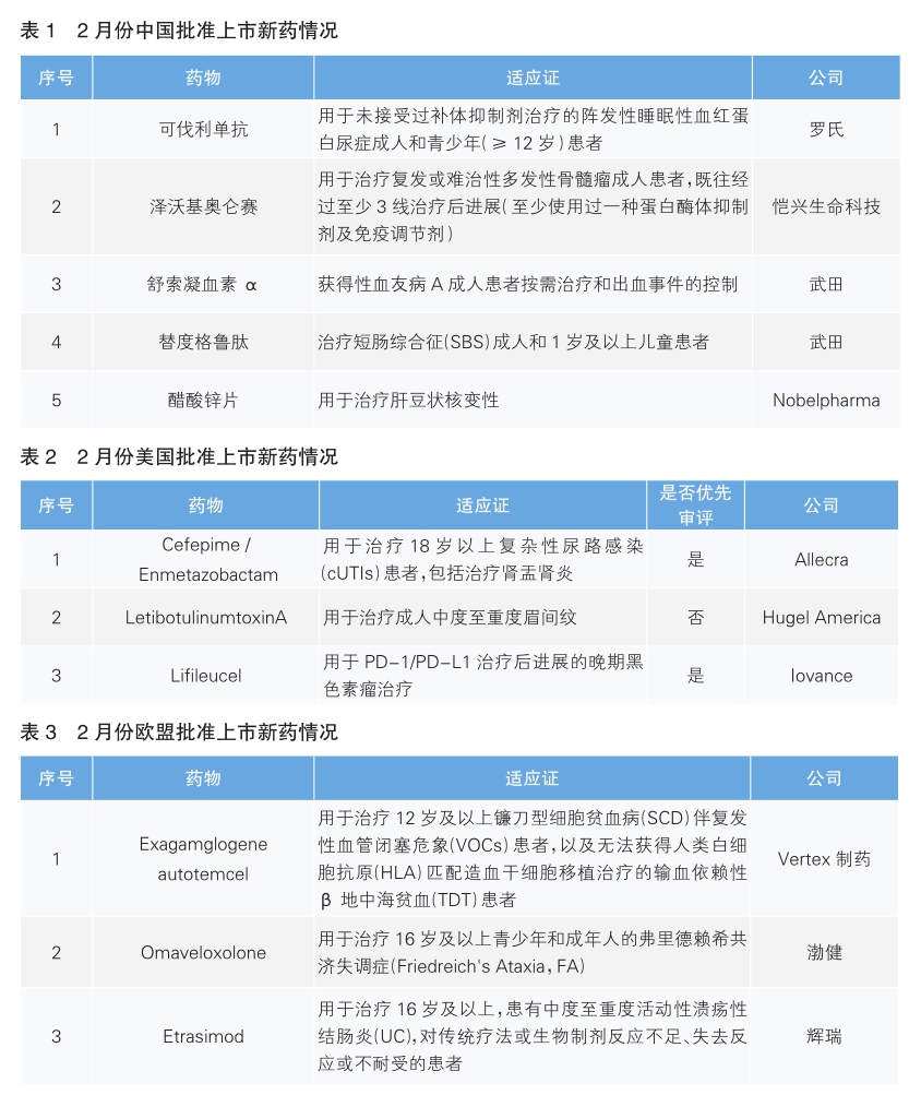 2月份,我國批準了5款新藥上市。根據Pharmadigger數據庫,當月全球范圍內首次獲批上市新藥為可伐利單抗和澤沃基奧侖賽(詳見表1)。