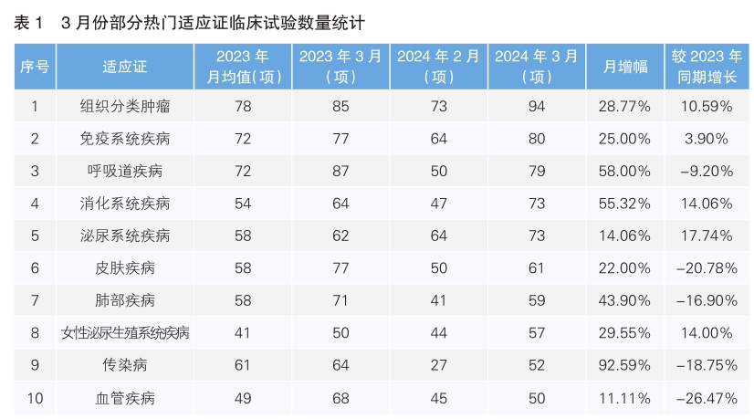 從3月份新增臨床試驗熱門適應證領域來看,組織分類腫瘤仍為最主要的熱門研發領域,試驗數量為94項,相較2月份增長28.77%;其次為免疫系統疾病,環比增長25%。月增幅最高的熱門適應證為傳染病,單月增幅為92.59%。月增幅最低的熱門適應證為血管疾病,單月增幅為11.11%。相較于2023年同期,同比增幅最為顯著的為泌尿系統疾病,增長17.74%;同比降幅最為顯著的是血管疾病,降幅為26.47%。(詳見表1)
