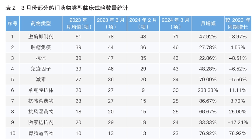 對新增臨床試驗藥物類型進行統計后發現,3月份最為熱門的藥物類型仍為激酶抑制劑,環比增長47.92%,但同比下降了8.97%;其次為腫瘤免疫藥物,環比增長27.78%,同比增長4.55%。月增幅最高的藥物類型為單克隆抗體藥物,增幅為233.33%,同比增長了11.11%。相較于2023年同期月降幅最大的藥物類型是激素拮抗劑,同比下降了17.24%。(詳見表2)