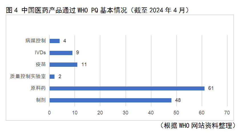 作為全球第一大原料藥生產(chǎn)國,據(jù)統(tǒng)計(jì),2015—2021年,中國原料藥企業(yè)共獲得707個(gè)歐盟CEP證書(歐洲藥典適應(yīng)性證書),居全球第二位;截至2023年7月,在美國獲DMF(藥物管理檔案)注冊3743個(gè)。在創(chuàng)新藥領(lǐng)域,截至2023年底,已有8款國產(chǎn)創(chuàng)新藥成功闖關(guān)美國。同時(shí),中國醫(yī)藥產(chǎn)品在參與世界衛(wèi)生組織預(yù)認(rèn)證(WHO PQ)方面也取得了不錯(cuò)成績(詳見圖4)。