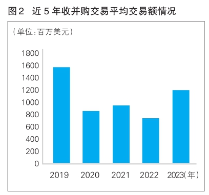 IQVIA Pharma Deals數據庫數據顯示,2023年,生命科學領域的收并購交易量(此處定義為合并、企業收購和資產拆分,已簽署但不一定完成)同比下降27%,與整體交易活動的放緩保持一致,為近5年來的最低點。然而,2023年簽署的收并購交易總額(包括或有對價在內)為1980億美元,同比增長37%。與此同時,收并購交易的平均交易額則從2022年的7.38億美元增至2023年的12億美元,增長了64%。(詳見圖1、圖2)
