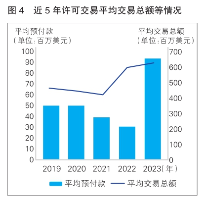 2023年,生命科學領域許可交易現金預付款的平均值同比上升200%,達到9400萬美元;中位值上升60%,達到2000萬美元。總體而言,被許可方在2023年共支付154億美元的保證預付款,比2022年的69億美元增長了122%,與2019年和2020年的總值持平,表明該領域的巨額許可費有所回歸。(詳見圖4)