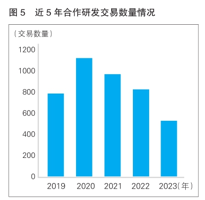 2023年,生命科學領域的合作研發交易(此處定義為涉及雙方或多方合作研發的發現或臨床前階段交易)數量同比下降36%,為5年來的最低點(詳見圖5)。這一年,幾家大型藥企拆分了不被優先考慮的產品,并終止了當前無進展的合作,以削減成本和精簡業務。盡管專利懸崖即將到來,而且需要推動長期創新,但大型藥企仍然保持謹慎,只尋求創新療法和技術,以補充其已有的龐大研發組合。與2022年相比,2023簽署的所有合作研發交易的總額僅下降5%,降至657億美元,仍高于新冠疫情前的水平。多目標和多模式聯盟繼續受到青睞,約42%的交易金額由10個高額研發聯盟貢獻。已披露的合作研發交易的平均總交易額同比下降15%,降至8.766億美元;交易中位數則下降32%,從2022年的7.83億美元降至5.3億美元。2023年,有22項合作研發交易的金額達到或超過10億美元,低于2022年的27項。