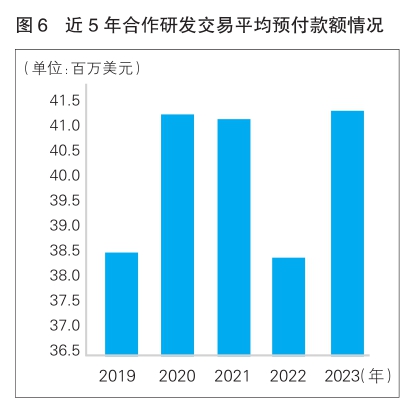 由于通脹壓力,2023年生命科學領域合作研發交易的平均預付款同比增長7%,從2022年的3830萬美元增至4120萬美元,與2020年和2021年持平;合作研發交易的預付總額達到13.2億美元,低于2022年的20.7億美元。(詳見圖6)