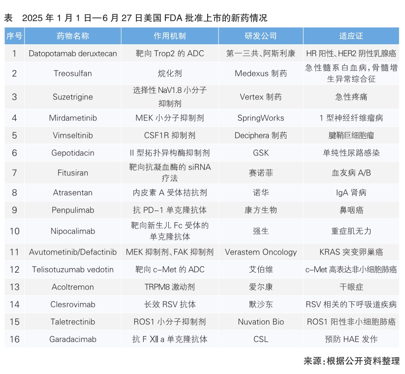 根據(jù)公開信息,2025年1月1日—6月27日,美國食品藥品管理局(FDA)共批準(zhǔn)16款新藥上市(詳見表),其中同類首創(chuàng)(First-in-class)藥物占比50%,這些藥物具有獨(dú)特的作用機(jī)制。