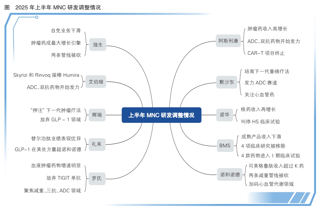 近期,隨著跨國藥企(MNC)2025年上半年財報陸續披露,行業競爭壓力與技術迭代加速的雙重效應進一步顯現,全球藥物研發格局正經歷深刻調整。部分企業選擇戰略聚焦,通過大幅削減非核心管線精簡運營;而面臨專利懸崖壓力的企業,則采取更為激進的轉型策略,在全球范圍內廣泛篩選具有臨床價值的創新管線,推動行業資源向具備持續創新能力的企業集中(詳見圖)。