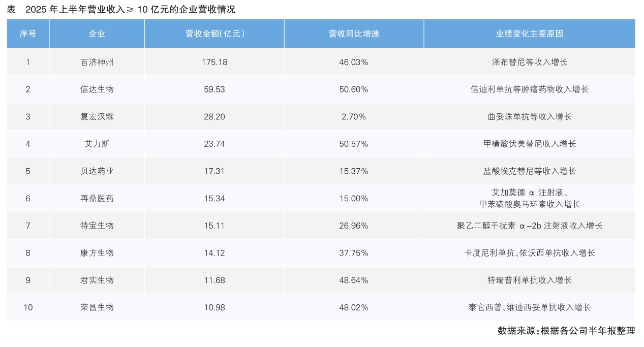 上半年營收超過100億元的企業僅百濟神州一家,實現營收175.18億元,同比增長46.03%。營收的增長主要緣于澤布替尼等核心產品銷售額的顯著提升。