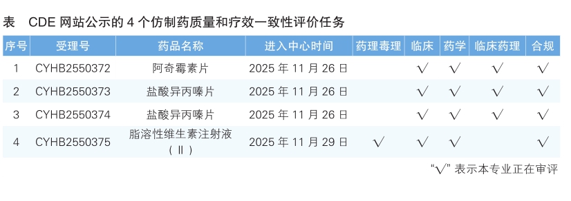 5.CDE網站公示4個仿制藥質量和療效一致性評價任務(詳見表),涉及阿奇霉素片等品種。