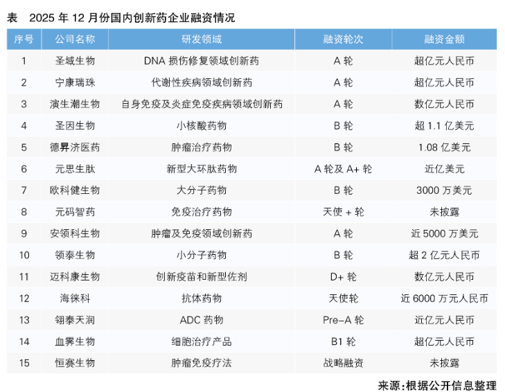 2025年12月份15家國內創新藥企業完成新一輪融資 最高單筆融資超1.1億美元,涉及小核酸藥物等研發領域
