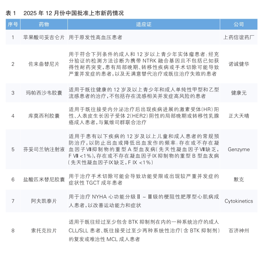 2025年12月份,我國(guó)共批準(zhǔn)8款新藥上市。根據(jù)Pharmadigger數(shù)據(jù)庫(kù),其中佐來曲替尼片、庫(kù)莫西利膠囊、鹽酸匹米替尼膠囊和索托克拉片為我國(guó)企業(yè)自主研發(fā)的全球范圍內(nèi)首次獲批上市的新藥(詳見表1)。