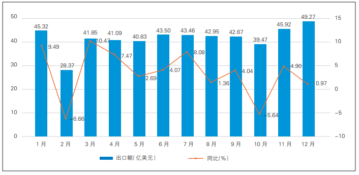2025年,我國醫療器械出口總額達504.69億美元,同比增長3.54%。我國醫療器械出口節奏受節假日因素影響顯著,除2月和10月外,其余月份出口額同比均為正增長(詳見圖),彰顯了外需市場的剛性支撐。具體來看,2月受春節假期影響,出口額降至全年最低,同比下降6.66%;10月受國慶假期及海外市場季節性調整影響,出口額同比下降5.64%。此外,從各時段表現來看,年初市場需求釋放,1月、3月出口額同比增速領跑全年;年末表現良好,12月出口額創下全年峰值,實現同比正增長。而在4—9月,我國醫療器械出口規模與增速均較為平穩。