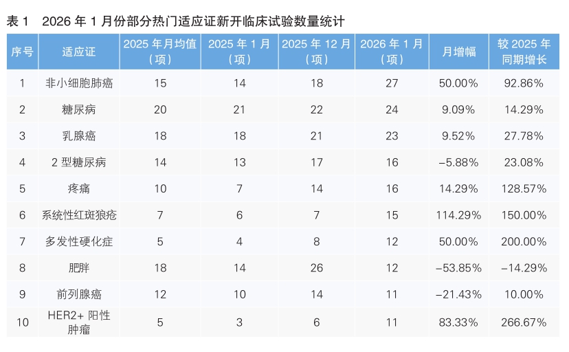 從1月份新開臨床試驗熱門適應證來看,非小細胞肺癌為最熱門的研發領域,新開臨床試驗27項,環比上升50%,同比上漲92.86%。其次為糖尿病,新開臨床試驗數量為24項,環比上升9.09%,同比上漲14.29%。值得注意的是,1月份新開臨床試驗數量上升幅度最大的熱門適應證為系統性紅斑狼瘡,由去年12月份的7項上升至15項,上升幅度為114.29%;新開臨床試驗數量下降幅度最大的熱門適應證為肥胖,由去年12月份的26項下降到12項,下降幅度為53.85%。(詳見表1)