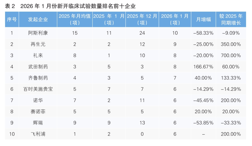 對新開臨床試驗的發起單位進行統計后發現,1月份發起臨床試驗最多的企業是阿斯利康,新開臨床試驗10項,環比下降了58.33%。其次為再生元,新開臨床試驗9項,環比下降了25%。新開臨床試驗數量上升幅度最大的企業為武田制藥,環比上升了166.67%。值得注意的是,1月份我國藥企齊魯制藥進入新開臨床試驗數量排名前十榜單,新開臨床試驗7項,環比增長40.00%,同比增長133.33%。(詳見表2)