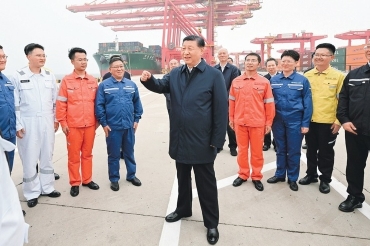 2024年5月22日至24日,中共中央總書記、國家主席、中央軍委主席習近平在山東考察。這是22日下午,習近平在日照港親切慰問港口科技工作者、運營人員、航運人員。新華社記者