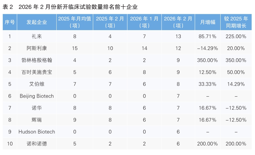 對新開臨床試驗的發起單位進行統計后發現,2月份發起臨床試驗最多的企業是禮來,新開臨床試驗13項,環比上升85.71%,同比上漲225%。其次為阿斯利康,新開臨床試驗12項,環比下降14.29%,同比增長20%。新開臨床試驗數量上升幅度最大的企業為勃林格殷格翰,新開臨床試驗9項,環比同比均增長350%。(詳見表2)