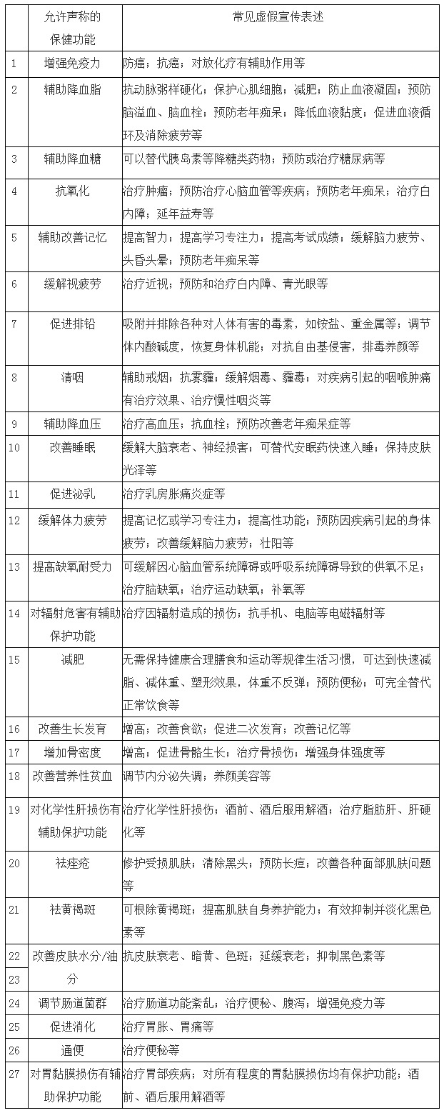 保健食品生產經營者應嚴格按照注冊或備案的保健功能進行標簽標識和宣傳表述。我們整理了市場上針對監管部門批準的27類保健功能的虛假宣傳表述(詳見附表)。凡有這些虛假宣傳表述的產品,無論是在商超等線下實體店銷售,還是通過網絡、會議、電視、廣播、電話和報刊等方式銷售,請消費者都不要購買,同時可以撥打熱線電話12331、12315進行投訴舉報。