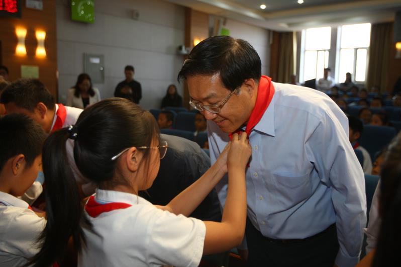 少先隊員向陳鋼敬獻紅領巾