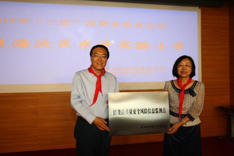 圖為陳鋼向海淀區東升實驗小學頒授“消費品質量安全風險信息監測點”牌匾