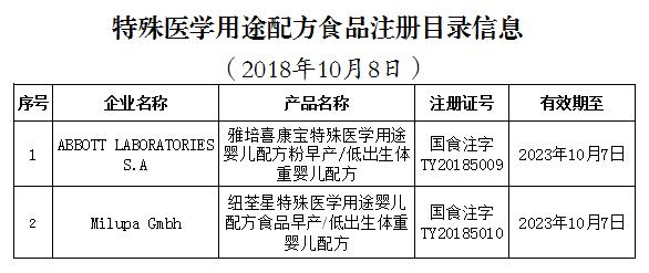 2018年10月8日,國家市場監(jiān)督管理總局批準2家企業(yè)共2個特殊醫(yī)學用途配方食品注冊。